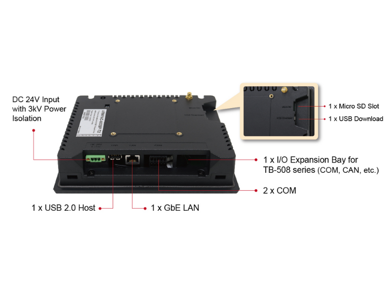 ARMPAC-6B features IP65 compliant front flat bezel with plastic chassis to provide a lightweight, durable, rugged and cost-effective factory automation solution. It comes in 1 x USB 2.0, 1 x USB download, 2 x COM and 1 x GbE LAN. As for expansion, it provides 1 x micro sim card slot, on board module for internet connectivity of 4G, Wi-Fi, Bluetooth and GPS with antenna holes; and 1 x I/O expansion bay for expansion card TB-508 series to expand I/O connectors for customers to meet their demands.