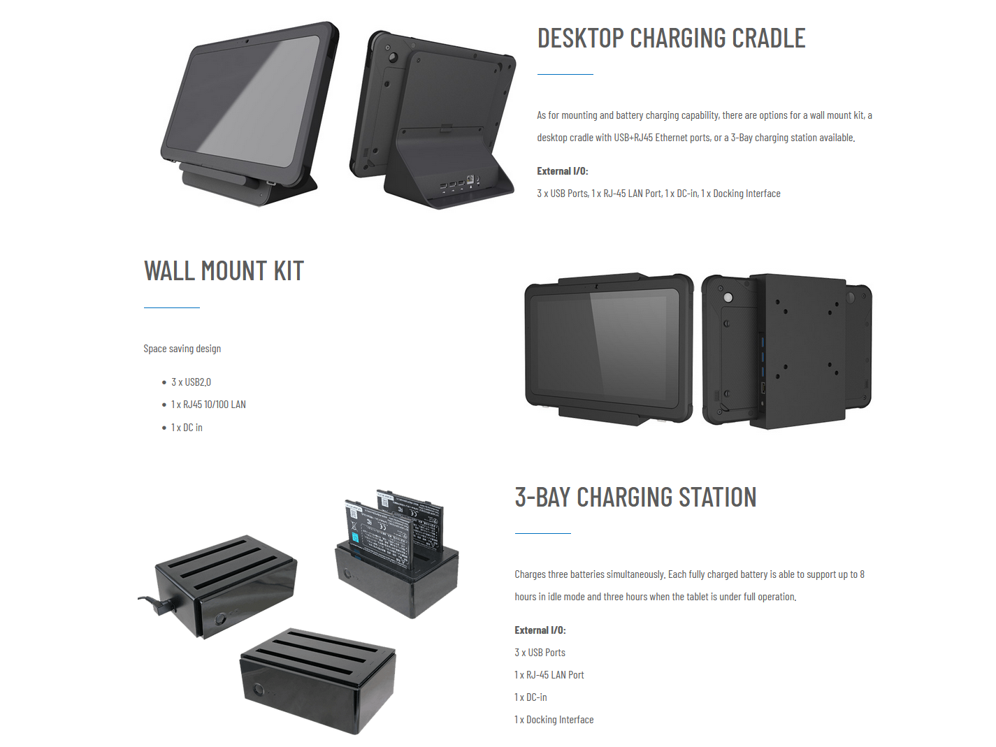 • CAXA0 Options for Wall Mount, Desktop Charging Cradle and 3-Bay Charging  Station