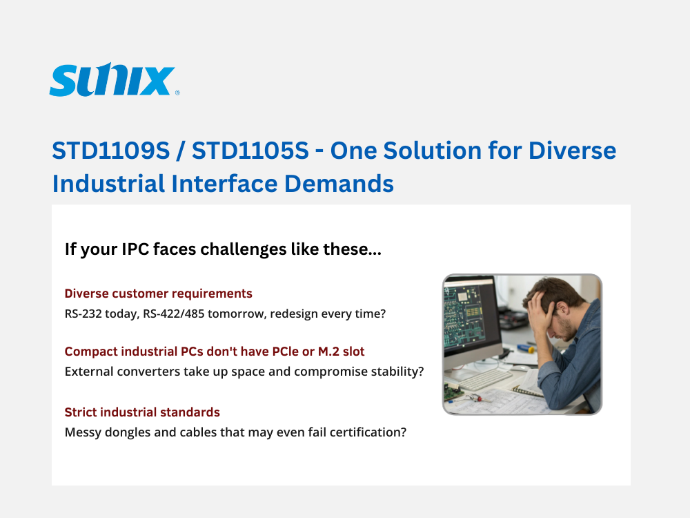 SUNIX, Taiwan, 28.10.2025 - The STD1109S / STD1105S are compact internal modules that convert onboard RS-232 signals to RS-422 or RS-485. They can be installed directly inside the chassis to enable stable long-distance and multi-drop serial communication, while keeping the original RS-232 port available and reducing the number of motherboard SKUs required.